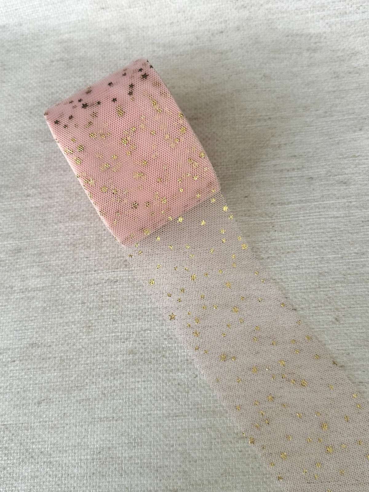 Теги: Фатин, світло рожевий персик, в золоті зірочки
