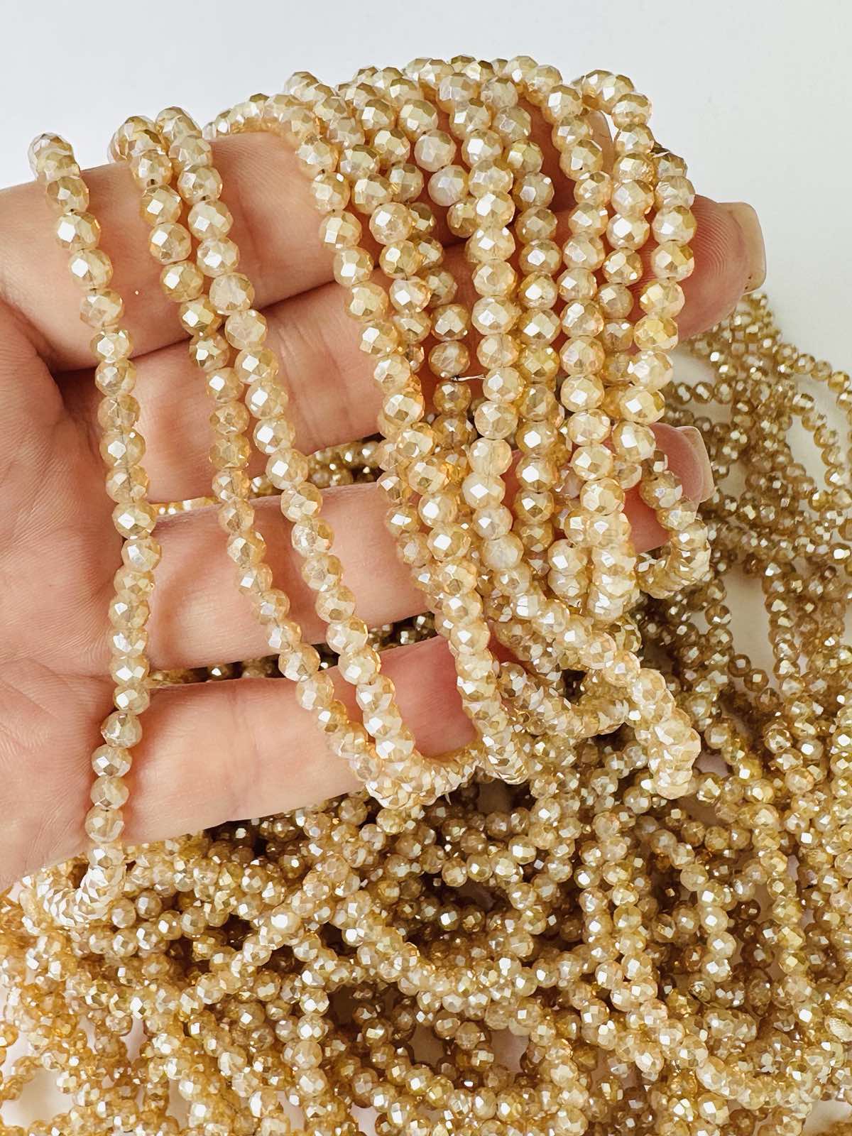 Кришталеві намистини грановані, до складу яких входить кришталь в різному співвідношенні зі склом, завдяки чому, намистини з кришталю мають яскравий блиск і ефектно переливаються безліччю різнокольорових іскор під променями світла. За допомогою даних матеріалів виріб отримує зовсім інший зовнішній вигляд, - більш елегантний, розкішний і дорогий.