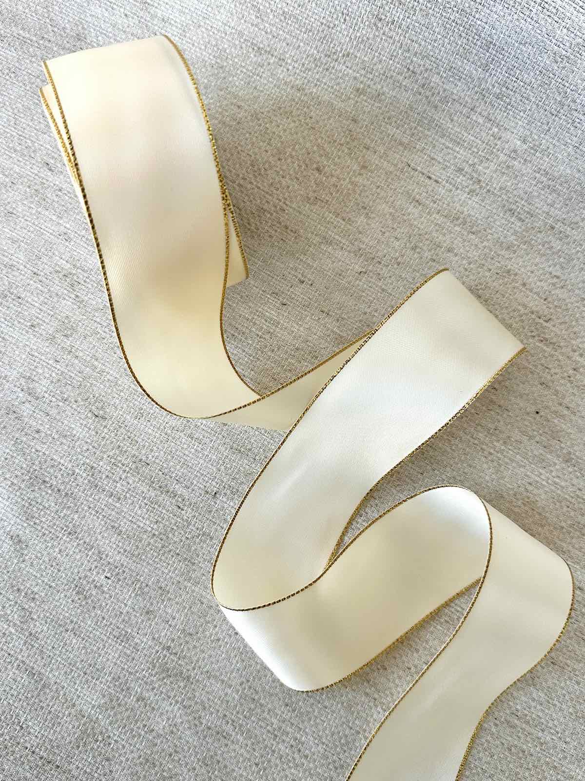 Теги: Сатинова стрічка, шириною 3, 8см, молочного кольору з золотим люрексом