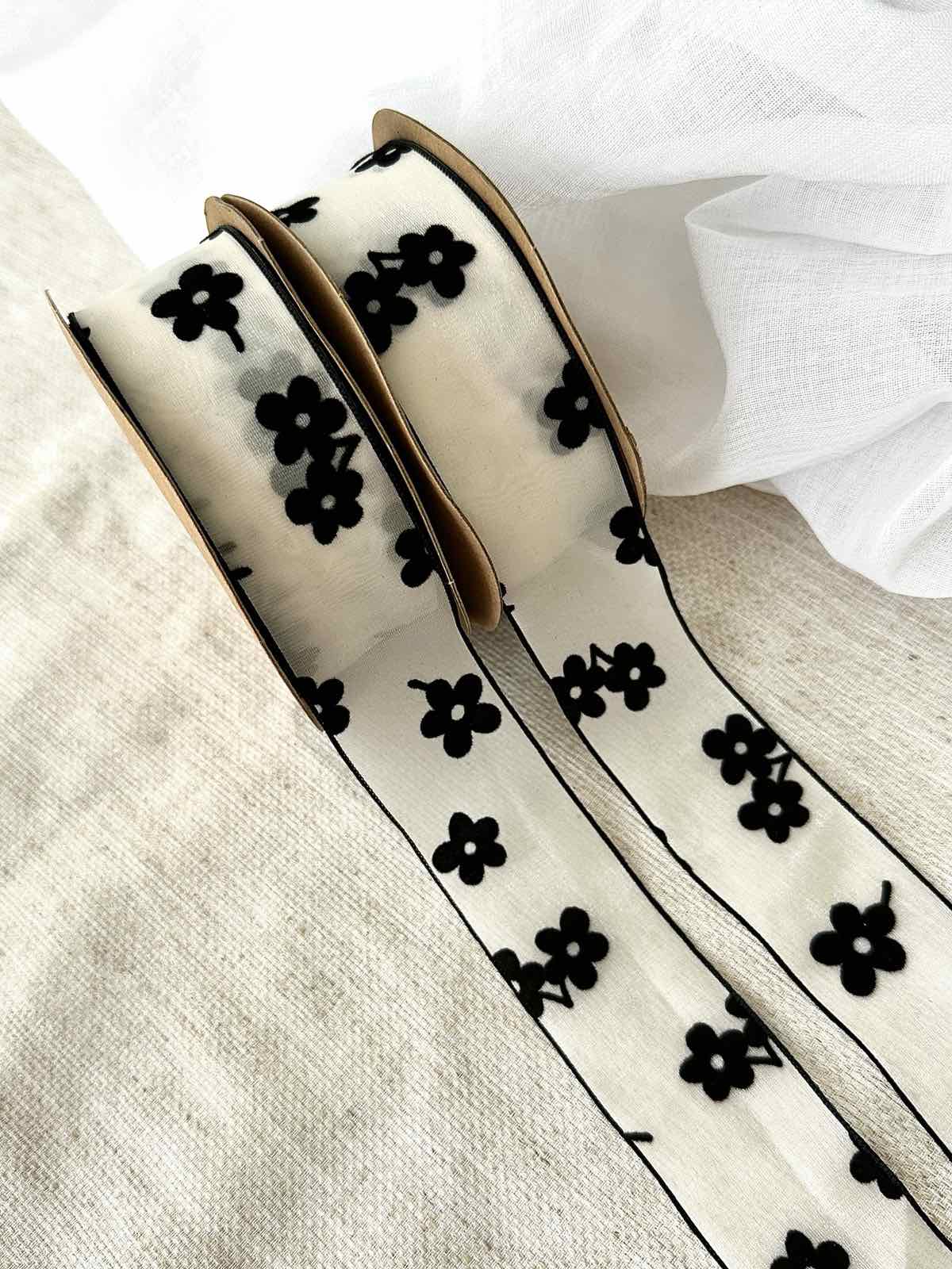 Стрічка в чорні крупні квіти світло молочного кольору 3,8см