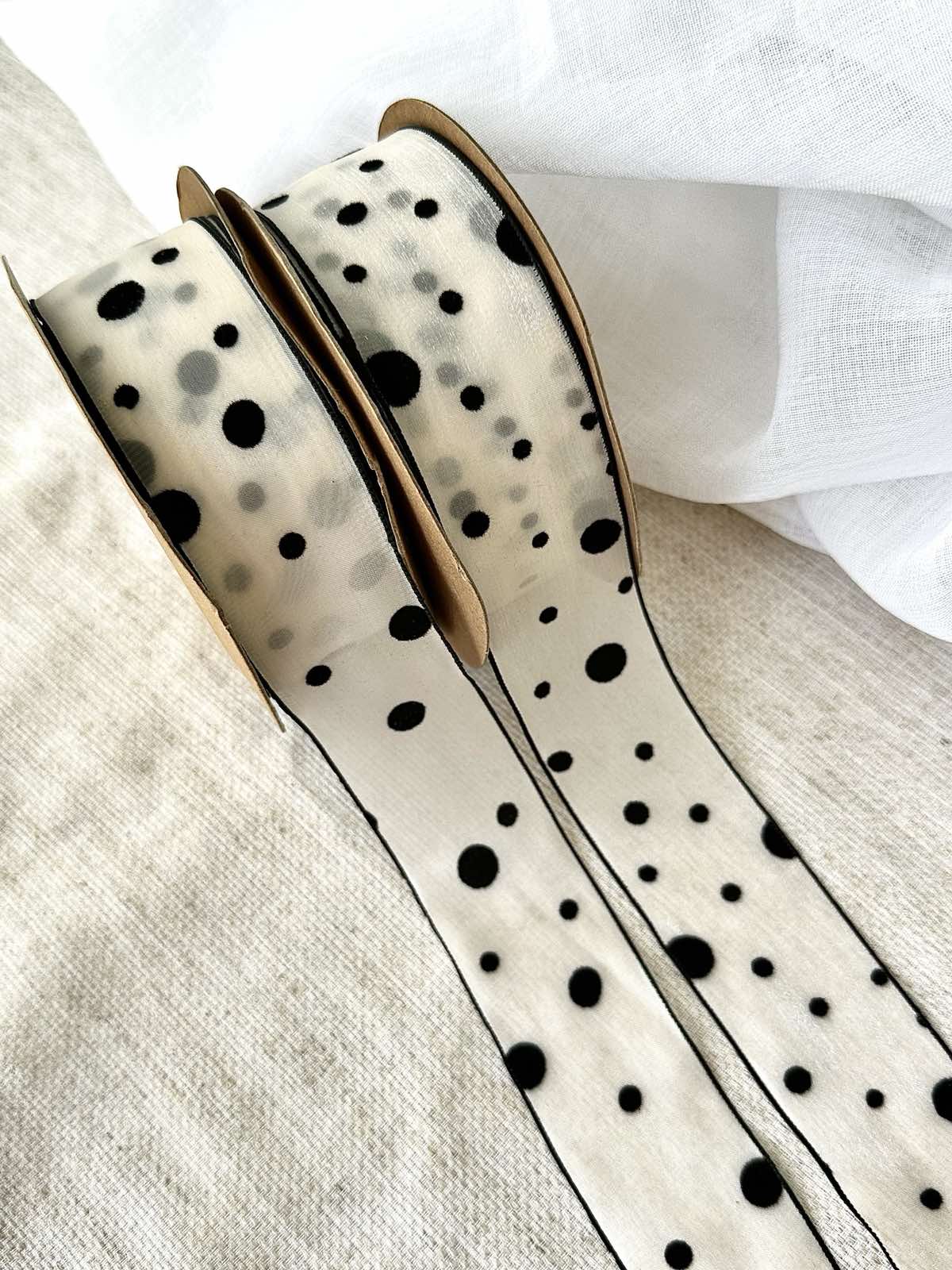 Стрічка в чорний горох світло молочного кольору 3,8см