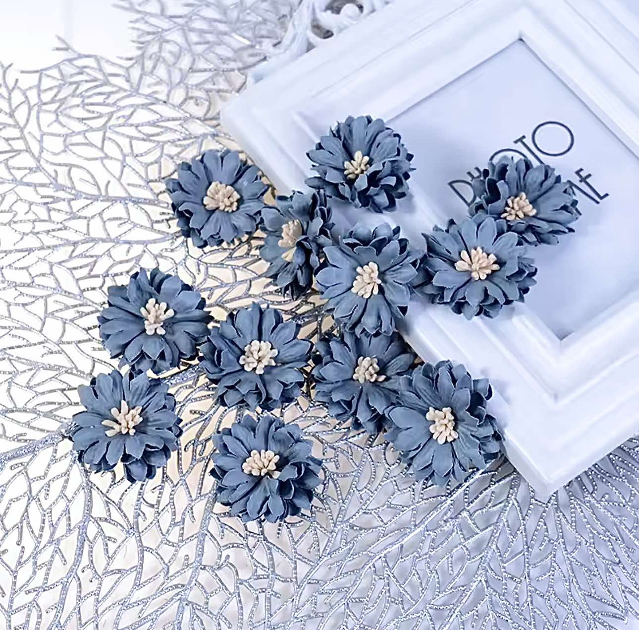 Теги: Тканинні квіти, з кремовими тичинками, діаметром 4см, темно сизого кольору
